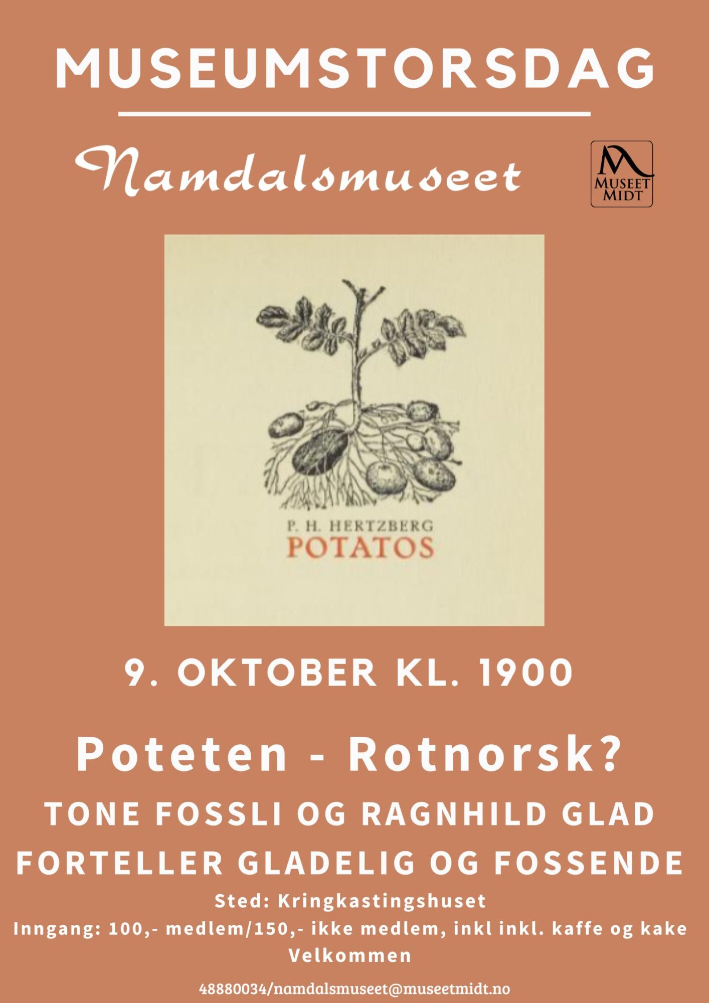 Tone Fossli og Ragnhild Glad forteller gladelig og fossende Om potetens betydning for samfunnet, bruksområder og sett i lys av et bærekraftsperspektiv.(Og lurer du på hva et bærekraftsperspektiv er? Så kom da vel!) Inviter en venn til en spennende og interaktiv Museumstorsdag. Sted: Kringkastingshuset Inngang: 100,- medlem/150,- ikke medlem (av Namdal Museumslag), inkl. enkel servering.…